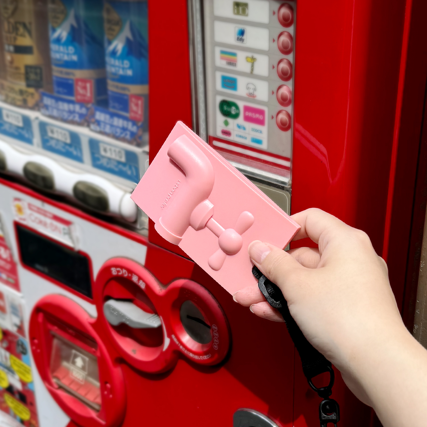 無駄なエネルギー(水や電気など)を節約しよう、というメッセージが込められたデザイン。カラビナが付いた専用チャーム付きでバッグなどにも取り付けできます。